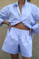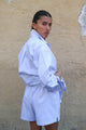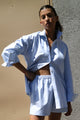 • Nico, pictured in the full set, wears a size small. Paulina, pictured in the navy linen shirt, wears her true size, extra small.