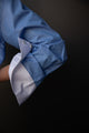 - Contrasting white collar and cuffs