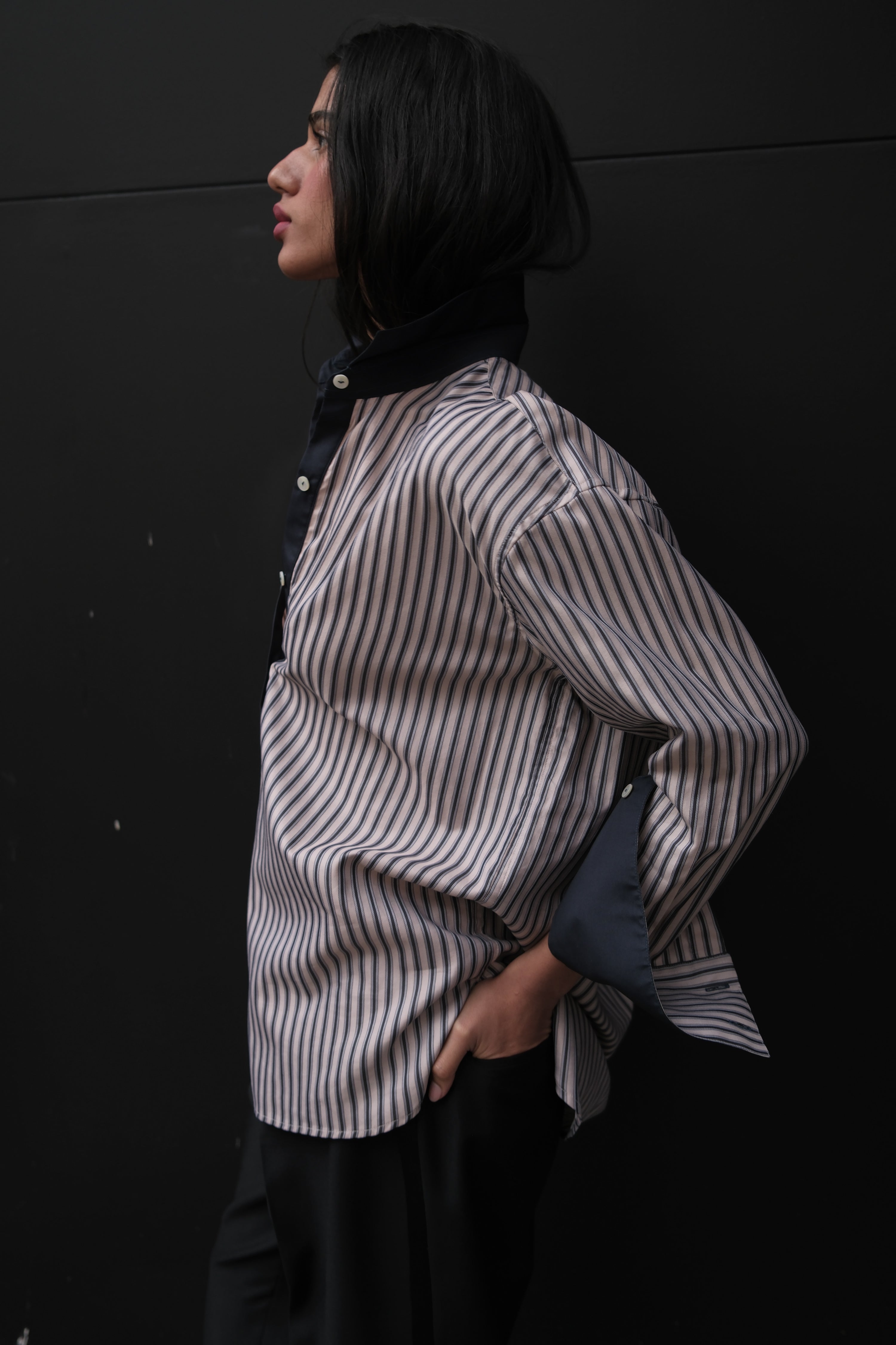 - Collar, placket and interior cuff lined in white Swiss poplin