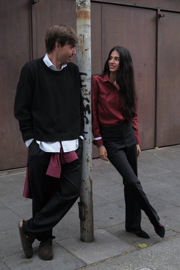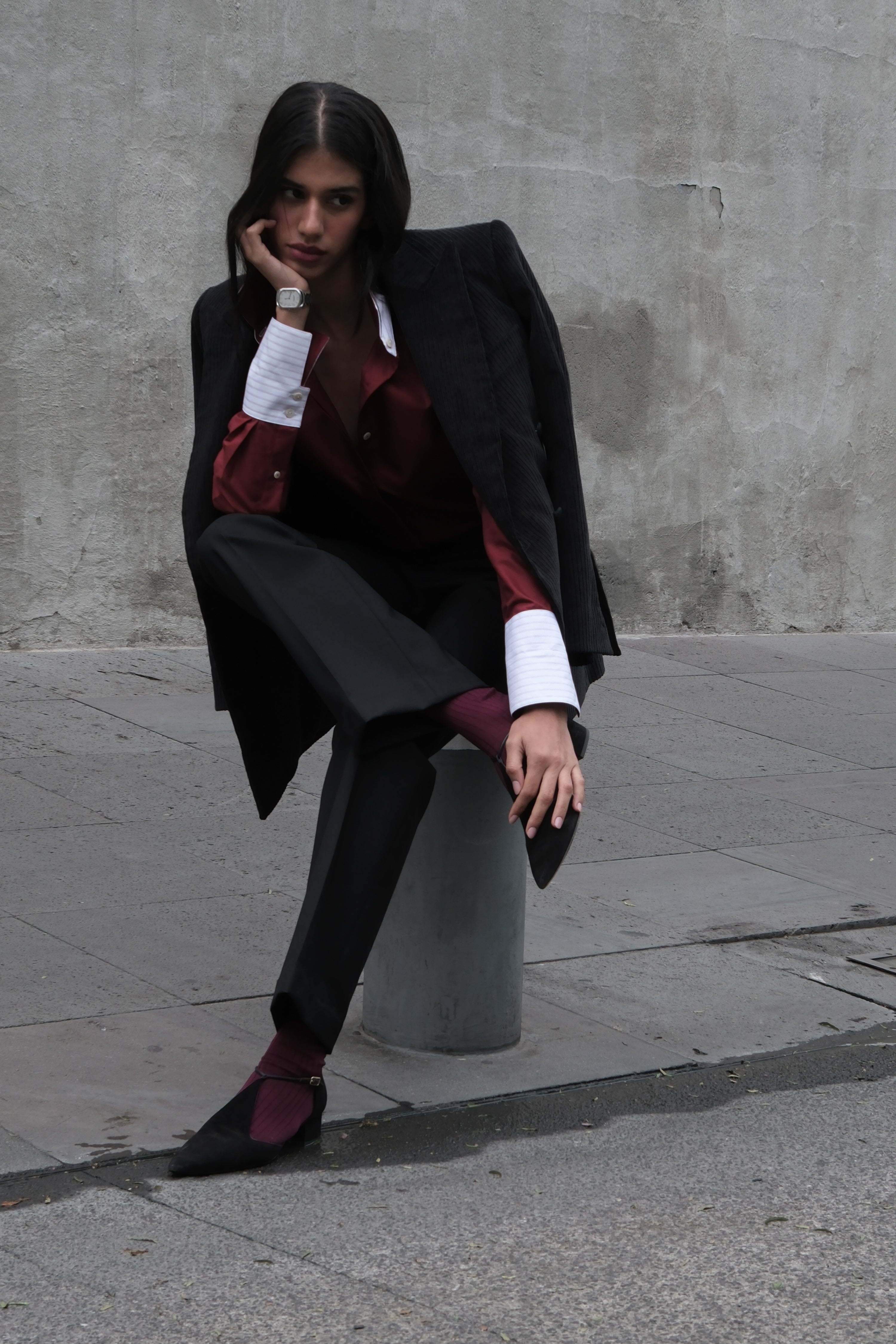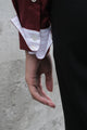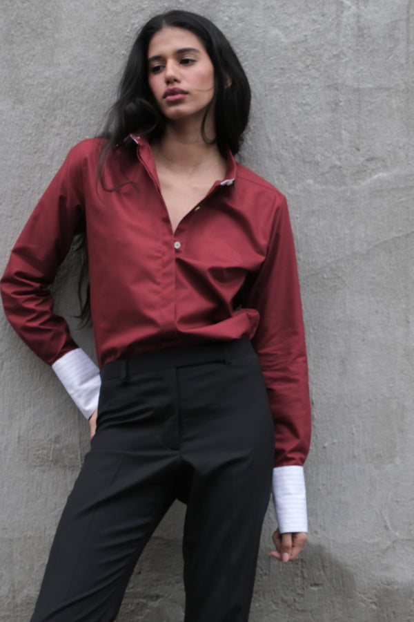 - Back of collar and back off cuff lined in contrasting striped Swiss poplin